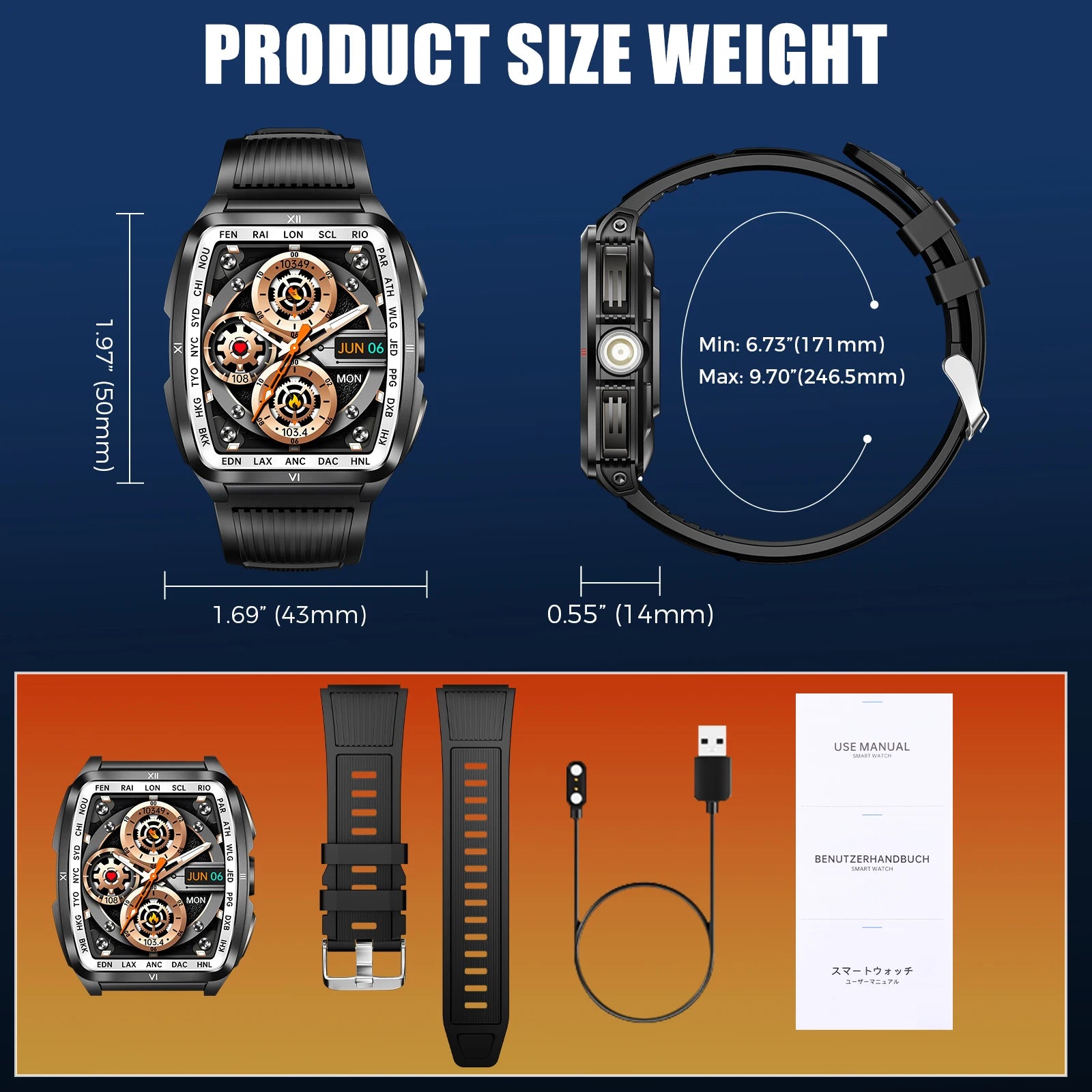 Function: fitness tracker,sleep tracker,Message Reminder,Call Reminder,Answer Call,Dial Call,Push Message,Big Three Needles,24 hour instruction,Chronograph,Alarm Clock,World Time,Calorie Counter,DIVER,Power Reserve,PRAYER,Perspective Window,Heart Rate Tracker,Countdown,Calculators