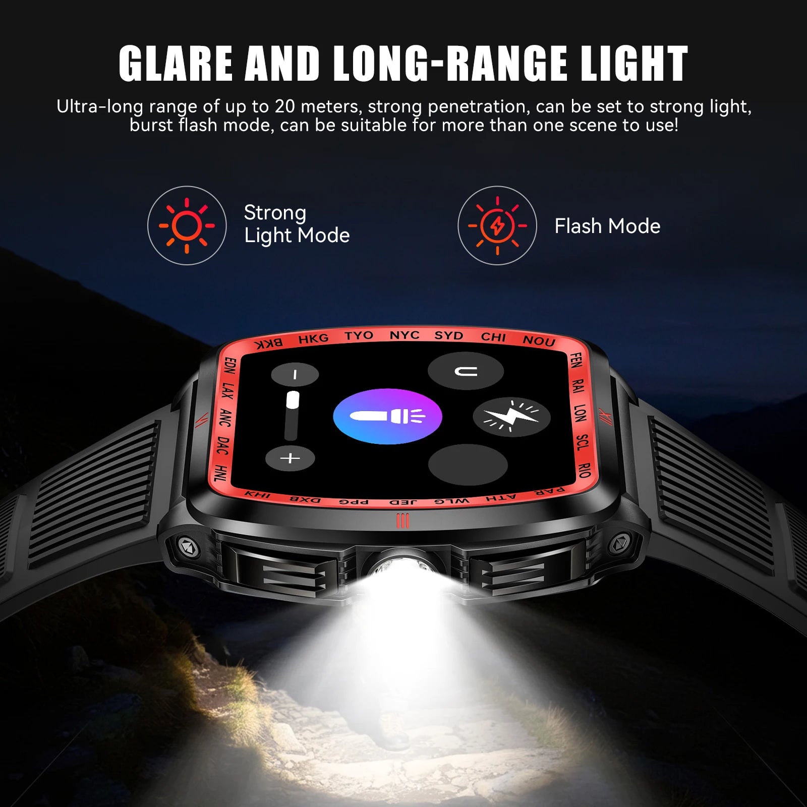 Powerful LED Flashlight & Long Battery Life - Illuminate your adventures with the built-in strong LED flashlight, covering 6-10 meters. Coupled with a robust 400mAh battery, Dealark tactical smart watch offers 5-7 days of use and a 15-day standby, ideal for camping and night excursions.